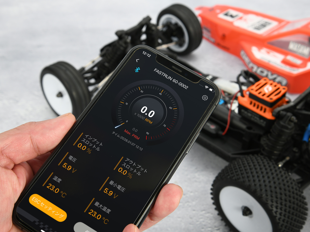 ESCからダイレクトでスマホと通信が可能。日本語表示対応の専用アプリから走行特性を自在に調整できます。