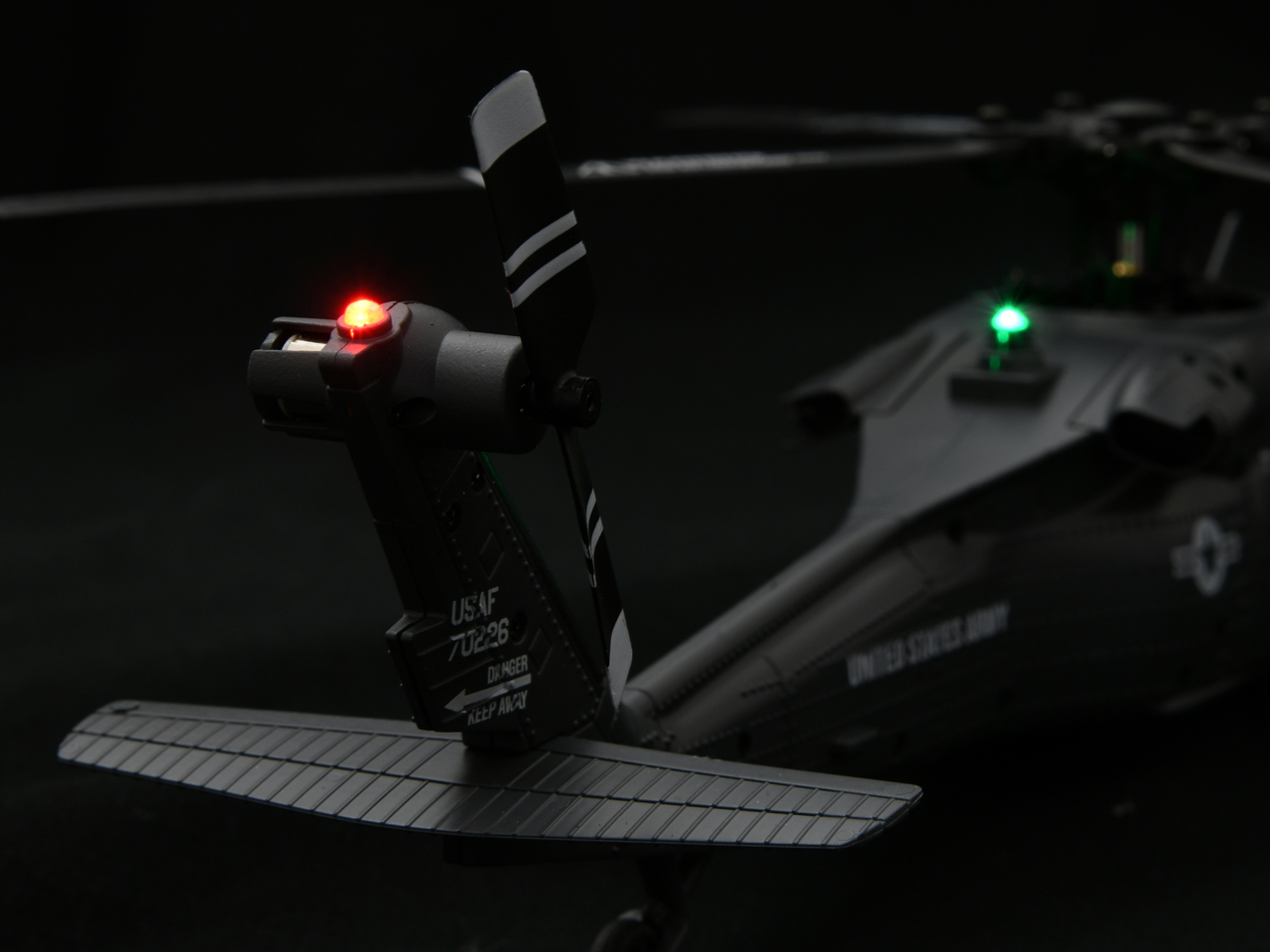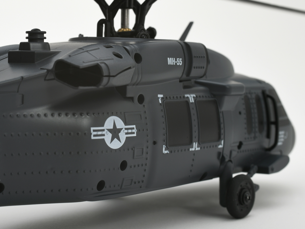 ローターヘッドには実機を彷彿とさせる、後退角のついた4枚ローターブレードを採用。シルエットの再現性はもちろん、ホバリングの安定性と操作性に優れ、安定した飛行性能を実現しました。
