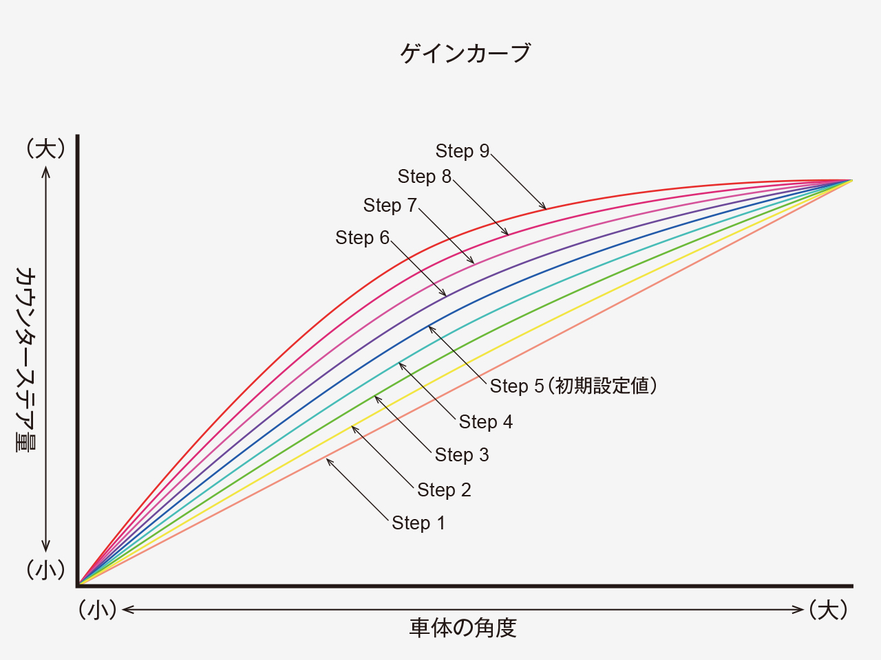 本体のSETボタンでゲインカーブを9段階に調整可能。ゲインの振れ幅を選択することでスタビリティを自由自在に設定し理想の走りを実現します。