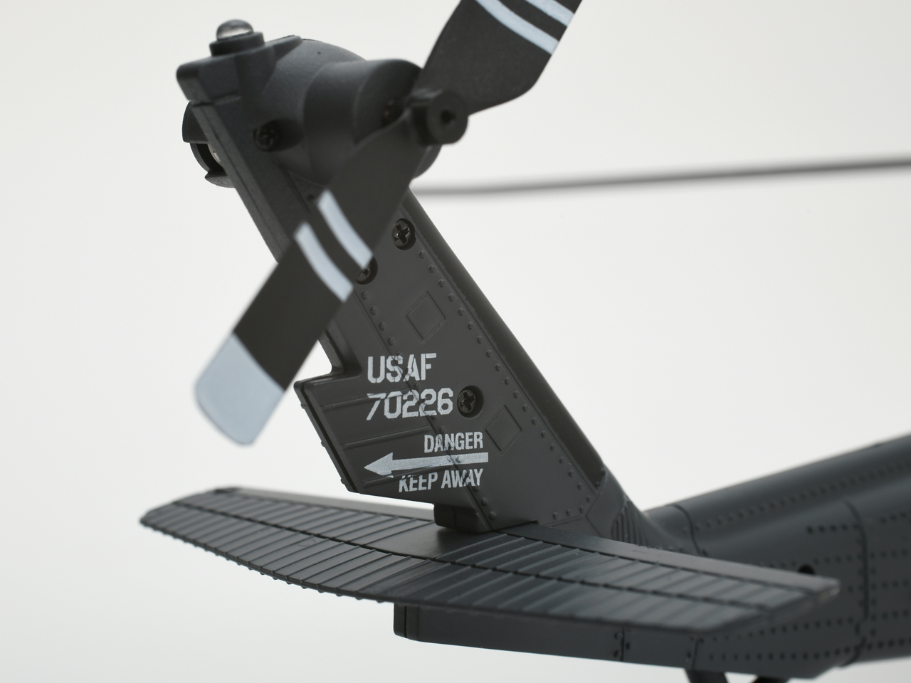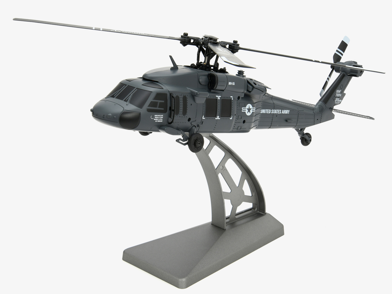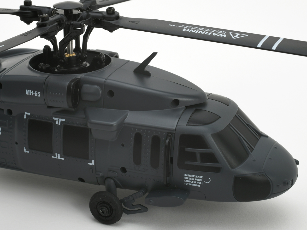 ローターヘッドには実機を彷彿とさせる、後退角のついた4枚ローターブレードを採用。シルエットの再現性はもちろん、ホバリングの安定性と操作性に優れ、安定した飛行性能を実現しました。